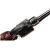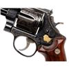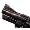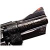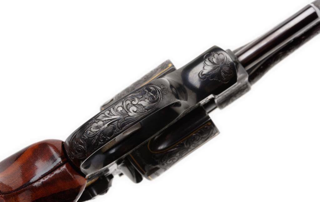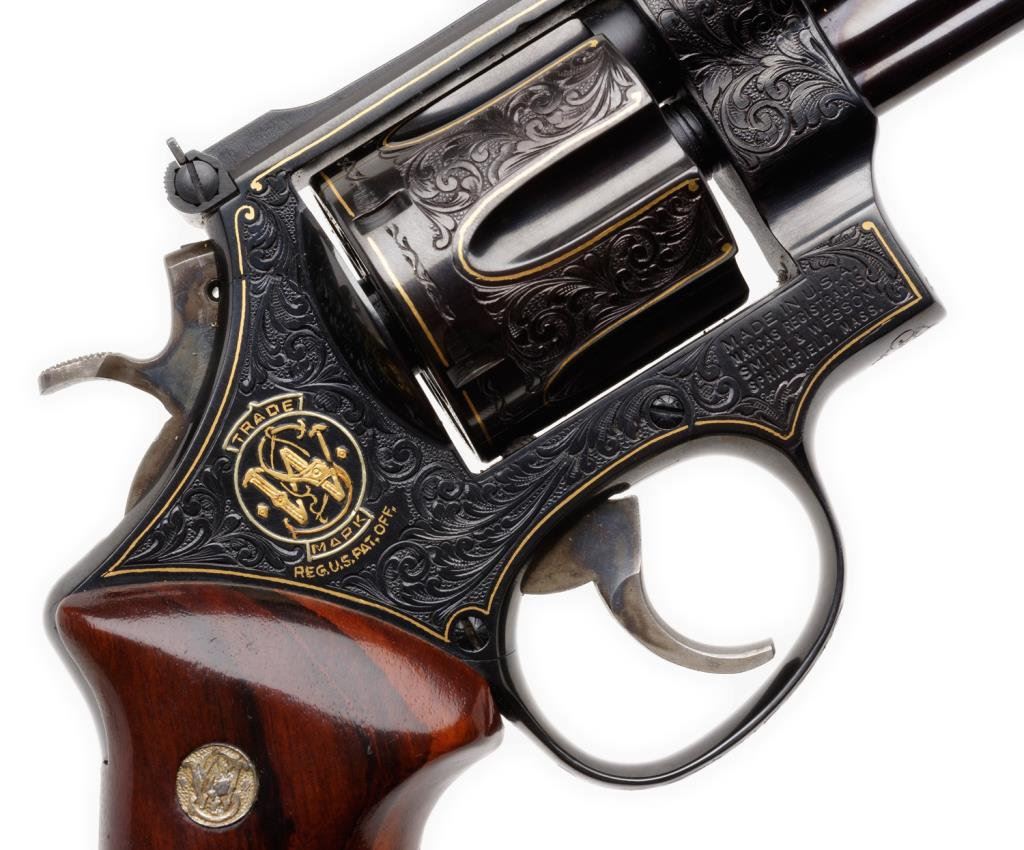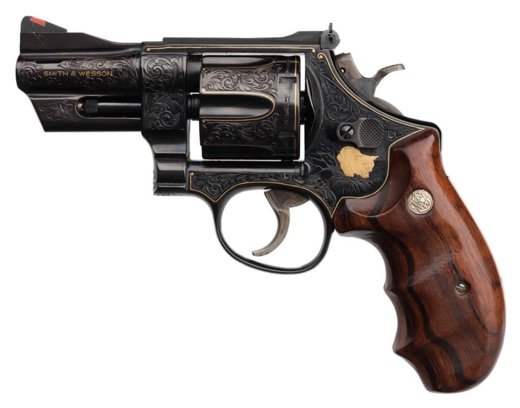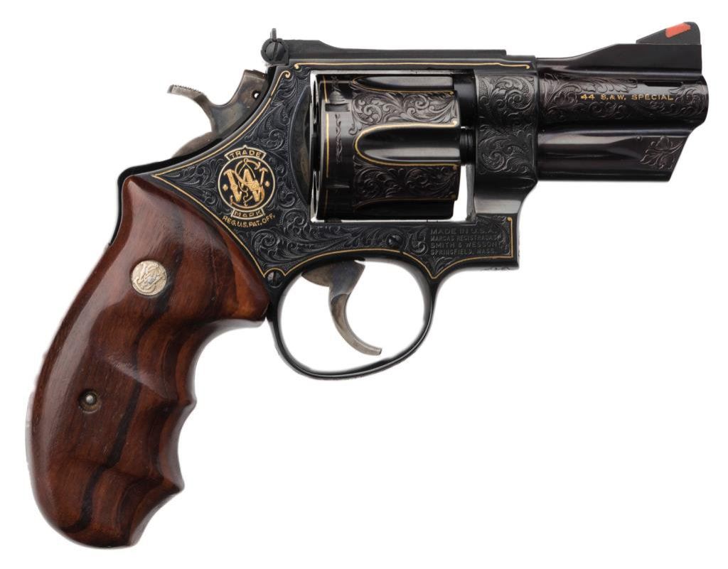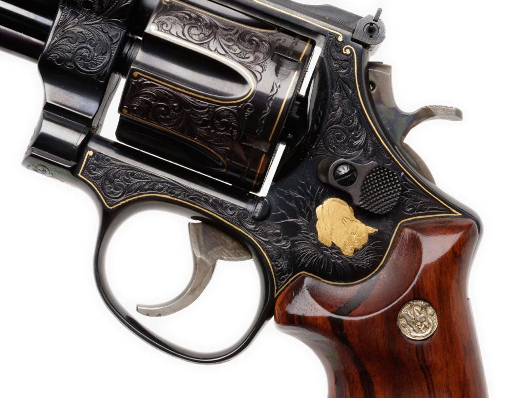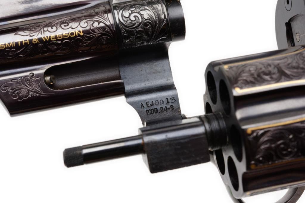 *Finely and fully custom engraved and gold inlaid Smith & Wesson Model 24-3 DA revolver by expert engraver Angelo Bee (signed on left lower side of frame), .44 S&W Special caliber, 3” barrel, S/N AEJ8013, blued finish, finger groove wood medallion S&W grips. This outstanding piece of firearms artistry is in overall excellent condition as engraved and gold inlaid including bordering, S&W emblem, caliber marking and an animal scene on the left side of the frame below the cylinder release; a stunning example of Bee’s work. Est.: $3,000-$5,000.