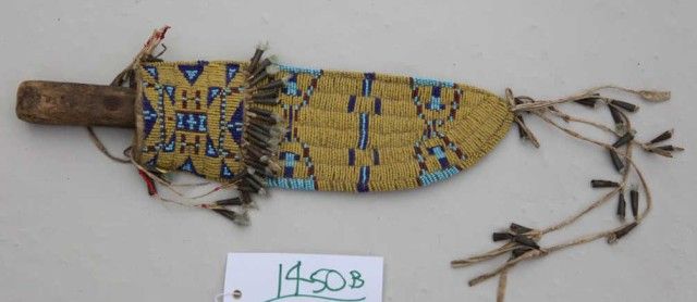 Finely beaded American Indian knife sheath with well-worn skinning knife; sheath is approx. 10” long and in very good condition with greasy yellow, turquoise, blue, red and purple seed beads and tine cone decorationsincluding some rawhide drops at the bottom of the sheath and top; accompanied by a collection brass disc marked “II 57”; appears to be of Sioux origin and really nice! Est.: $1,000-$2,000.