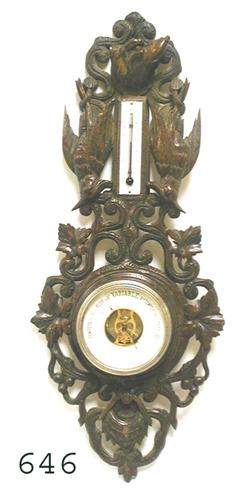 Finely carved barometer with dog head, hanging game birds, and entwined leaf and vine carving – marked “Tempete BdePluie Pluie ou Vt Variable Bau Temps Bau Fixe Tres Sec. Barometre Aneroide” App. 26”
