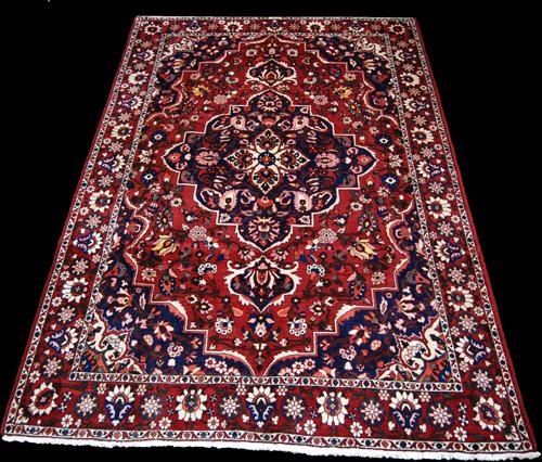 Finely detailed Persian Bakhtiari Desert Rug. Bakhtiari is an ancient southwestern Iranian tribe. Bakhtiari were nomaidc pastoralists and weaving Rugs was and still is a unique way of expression and telling stories. This beautiful piece is made of fine quality baby lamb and wool pile on cotton foundation, All natural vegetable dye, incorporating a finely detailed floral pattern on a rich red background; large centerpiece medallion; crowned corners and an intricate floral border. Signed Desert Rug. Hand woven in Bakhtiari-Iran. Size: 6 feet 10 inches X 10 feet 2 inches. Country of origin: Iran.