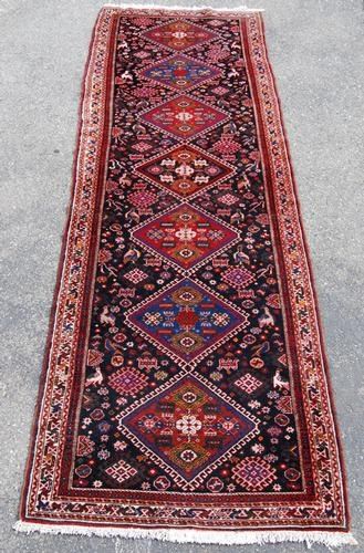 Finely done hand woven hybrid design Persian Bakhtiari Runner. Made of fine quality lamb's wool pile on cotton foundation. All natural vegetable dye, incorporating a hybrid design that incorporates both floral and hunting motifs on a dark background; center row of medallions and an intricately done floral border. Size: 11 feet 7 inches X 3 feet 6 inches. Hand woven in Bakhtiari from Iran.