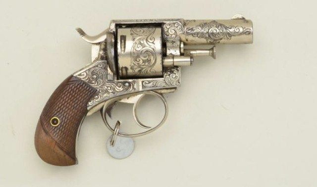 Finely engraved period close copy, likely Belgian-made, of a Webley Bull Dog DA revolver marked “British Lion” and “W. Moore & Co.”, .44 cal., 2-1/2” barrel, nickel finish, checkered wood grips, #NVSN. This gun is in overall very good to fine condition showing considerable original nickel finish, exceptional scroll engraving on the frame, barrel and cylinder, very good action and bore, very good grips showing some wear andan old small loss to the front toe of the left grips. These guns were popular on the Western frontier and most major cities where self-protection was a necessity from the “rougher element” of the community. Est.:$800-$1,600.