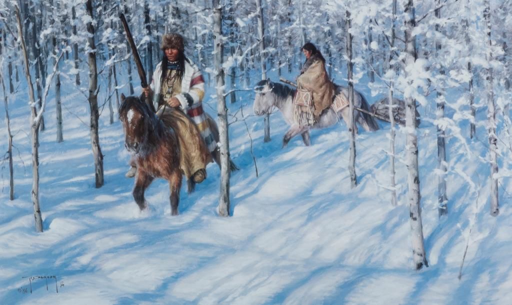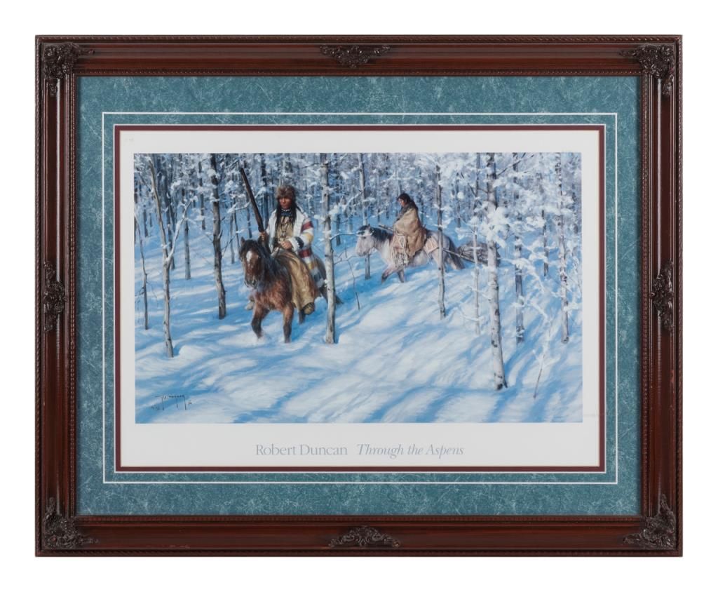 Finely framed and double matted color print by Robert Duncan entitled “Through the Aspens” depicting an Indian and his bride riding through the woods in winter snow, approx. 26” x 31-1/2” overall. Est.: $125-$250.