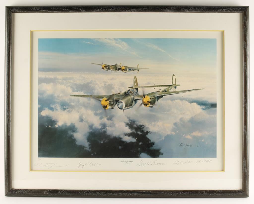Finely framed and matted limited edition (905/1,000) litho entitled “Lightning Strike” by noted artist Robert Taylor, hand signed by the artist and also hand signed by 4 P-38 Lockheed Lightning pilots; Col. Gerald Brown, Col. John Mitchell, General Jay Robbins and Col. Rex Barber. Est.: $150-$300.