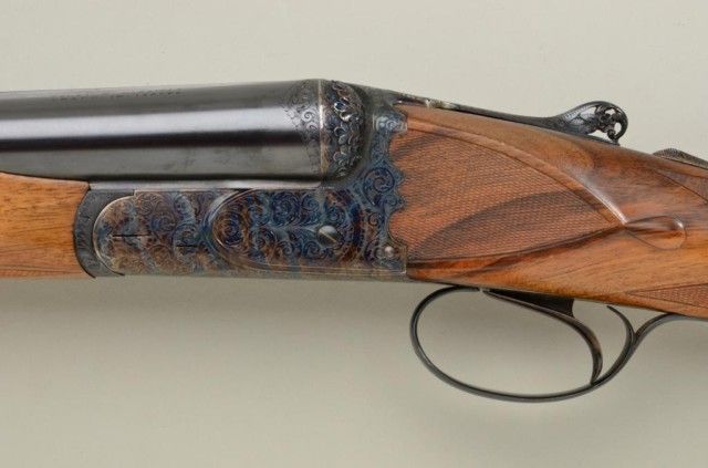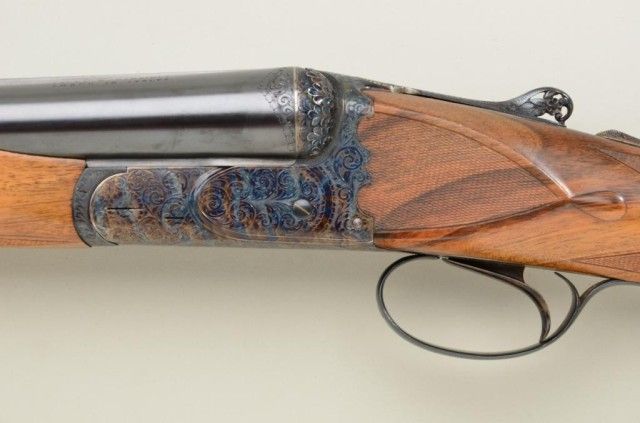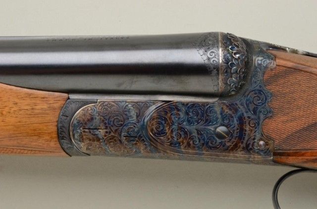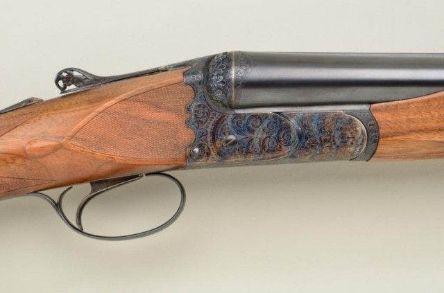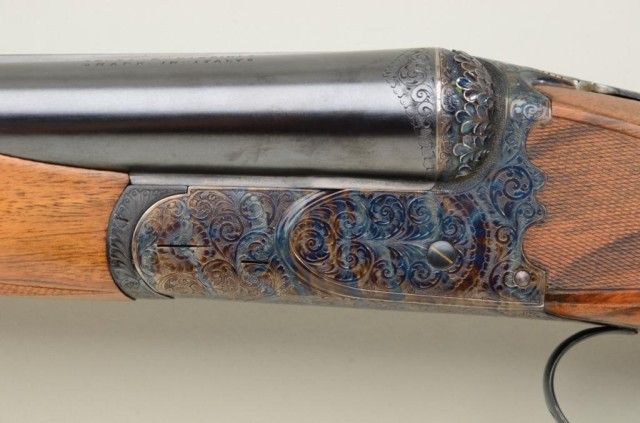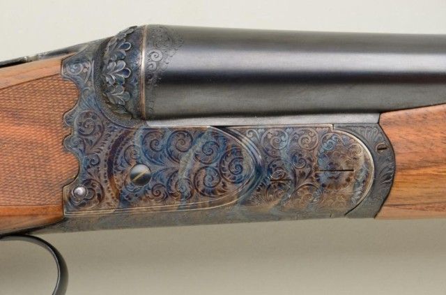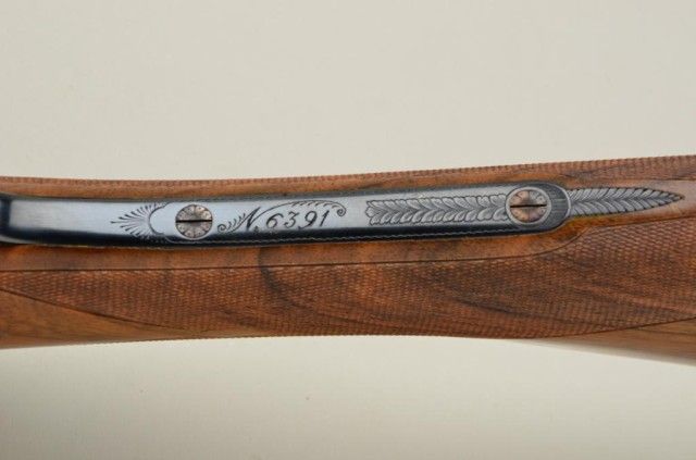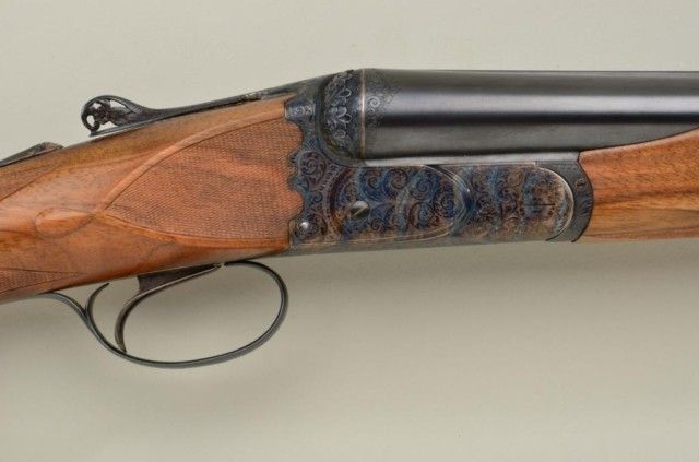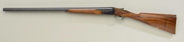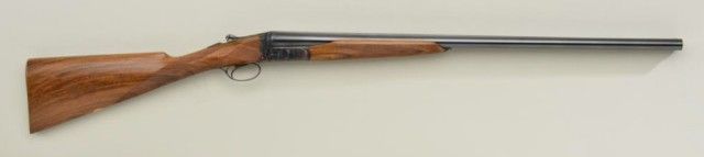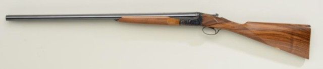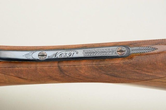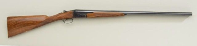 Finely handcrafted Italian 12 gauge double barrel shotgun by Zoli & Rizzini showing 28" barrels 45-1/2" overall, low rise hand filed rib, single trigger, auto ejector, English style straight stock, checkered butt, serial#6391. The action is a box lock type and shows fine scroll engraving with chiseled rear of frame and pierced lever. The gun is stocked in a light colored European walnut and finely checkered. The gun is in finecondition showing 98-99% plus original blue and case hardening and very little if any use. The stock measures 14-1/2" to the end of the pull and is showing approx 1-1/2" drop at the comb to 2-1/4" drop at the heel withno cast. A fine and expensive shotgun showing master craftsmanship not to be confused with cheaper cousins by Zoli. Robert E. Petersen collection. Est.; $2,000-$4,000.