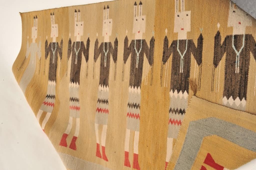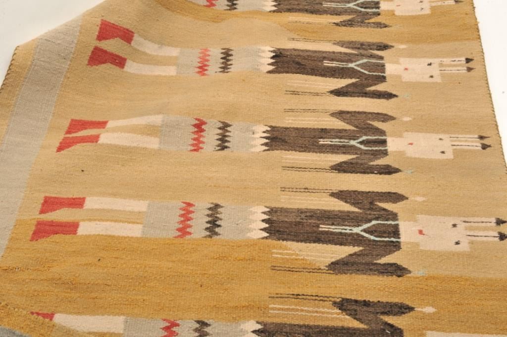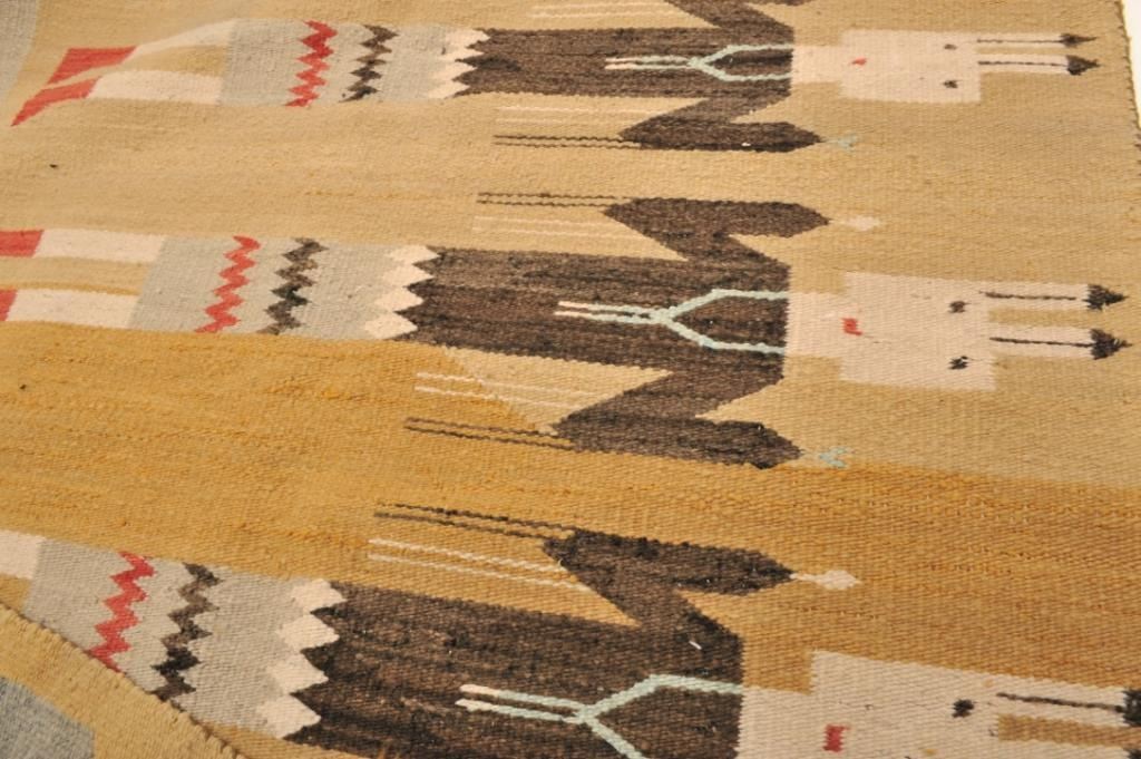 Finely woven Navajo rug with yei or dancers 65 x 35. Good condition, slight fading, unusual turquoise necklaces on figures. Est. $350-$700.