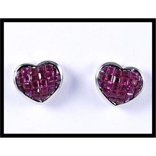 These sweet 18K white gold ruby heart shapped earrings contain 48 invisible set rubies. They measure 10mm (3/8") x 9mm (11/32") and weigh in at 3.9 grams. These are