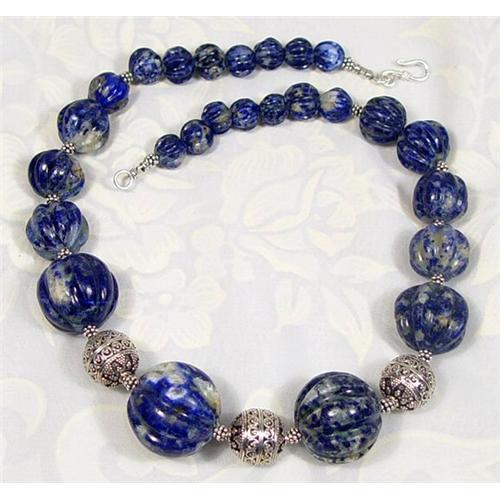 With a marvelous gram weight of 163 this piece of jewelry is worthy of serious consideration! Finished with colorful NATURAL CARVED LAPIS MELONS complimented with fine sterling the sparkle and impact is tremendous. The center lapis measures 25mm of 1" in diameter. The overall length is 18. The PERFECT accessory for bluejeans or a suit....