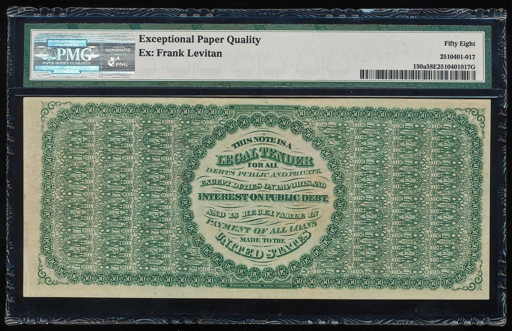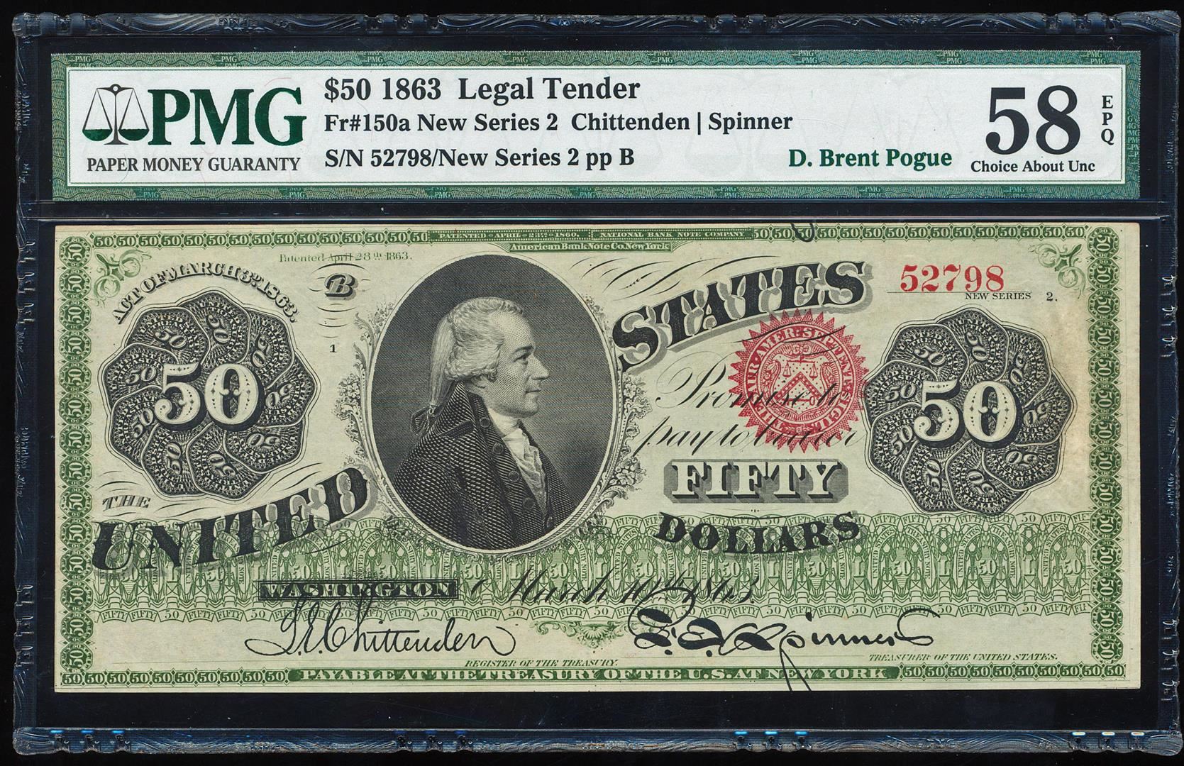 Finest Known - 1863 $50 Hamilton Legal Tender Note Fr.150a PMG Choice About Uncirculated 58EPQ. These early $50 legal tenders are elusive in any grade and this one is the finest graded by PMG and is in fact, it's the finest of any 1862 or 1863 $50 legal tenders. The note features a profile or Alexander Hamilton on the obverse and an intricate design pattern on the reverse. PMG Certified.