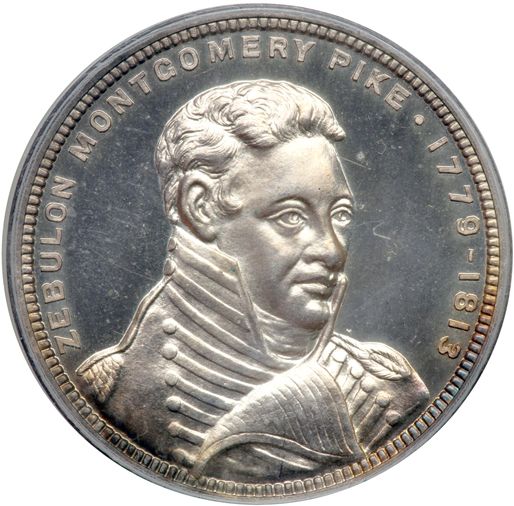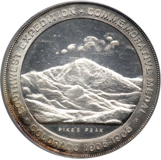 Finest Known. 1906 Pike's Peak Centennial, Southwest Expedition Medal, SC$1 HK-335 PCGS Proof-66. PCGS graded Proof 66Finest known certified example. Silver. 34 mm. A exceptional example of this medal that marks the centennial of Zebulon Pike's Southwest Expedition, and the discovery of the mountain that now bears his name. Designed by C.E. Barber and struck at Philadelphia Mint. Brilliant surfaces with deeply mirrored fields, and frosty devices. Light smokey toning at lower edge on obverse and reverse. Only 250 proofs are known to have been struck, and it is believed that there are less than 75 surviving specimens. NGC census shows 31 graded, with Proof-65 Cameo being the finest.