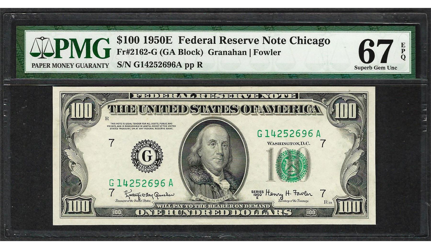 One 1950E $100 Federal Reserve Note Chicago Fr.2162-G PMG Superb Gem Uncirculated 67EPQ. A nicely margined, pack-fresh note that is the finest known example for this popular series currently graded at PMG. PMG Certified.