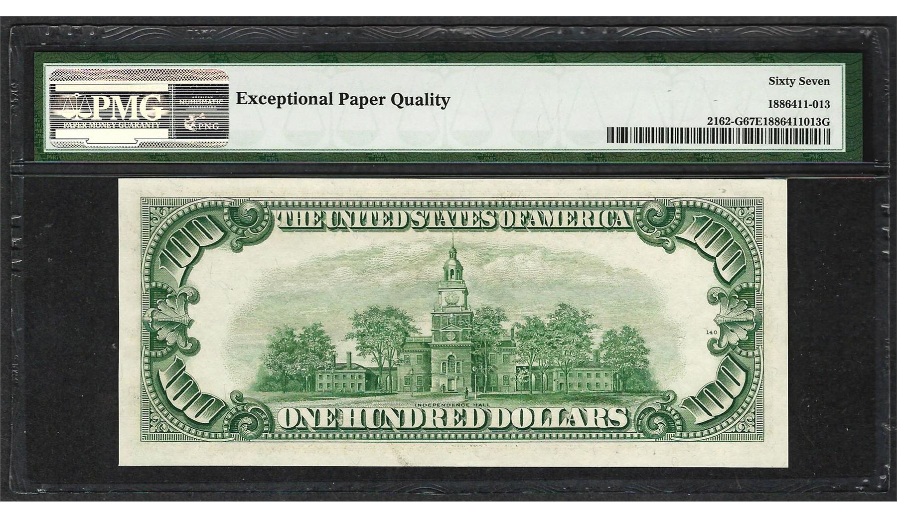 One 1950E $100 Federal Reserve Note Chicago Fr.2162-G PMG Superb Gem Uncirculated 67EPQ. A nicely margined, pack-fresh note that is the finest known example for this popular series currently graded at PMG. PMG Certified.