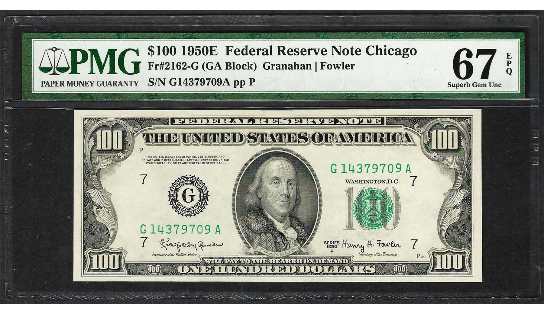One 1950E $100 Federal Reserve Note Chicago Fr.2162-G PMG Superb Gem Uncirculated 67EPQ. A nicely margined, pack-fresh note that is the finest known example for this popular series currently graded at PMG. PMG Certified.