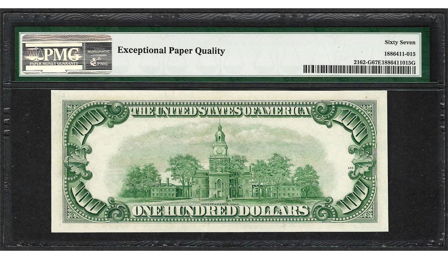 One 1950E $100 Federal Reserve Note Chicago Fr.2162-G PMG Superb Gem Uncirculated 67EPQ. A nicely margined, pack-fresh note that is the finest known example for this popular series currently graded at PMG. PMG Certified.