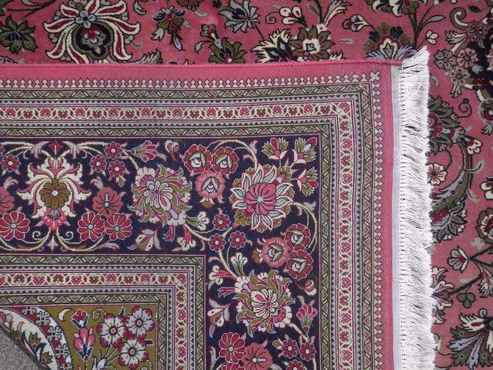 Finest quality authentic Persian royal Qum silk and Kork. Size 8.2 x 12.0 feet, made of fine quality silk and Kork (best quality lamb's wool) pile on cotton foundation, all natural vegetable dye, this is a special rug in that it utilizes the highly sought after silk and Kork wool, which is so smooth yet very difficult to weave with. Only the most skilled carpet weavers are able to weave using silk and Kork wool, and this rug is no exception. With a beautiful floral pattern and intricately done border, a truly exceptional rug. This is a collector's item. Hand woven by a master weaver in Qum, Iran.
