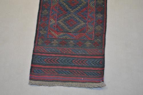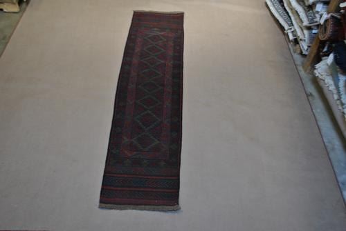 Nice looking hand woven authentic Persian Balooch. Made of fine quality lamb's wool pile on wool foundation. Incorporating a nice looking allover design and framed beautifully by an intricately done geometric border. Balouch Rugs are all collectible examples of nomad art as each piece exploits the design skills and showcases the individuality of each weaver. Balouch hand-woven Rugs using beautiful vegetable dyed baluchi wools. Size: 1 feet 10 inches X 7 feet 8 inches. Hand woven in City of Baloochistan from Iran.