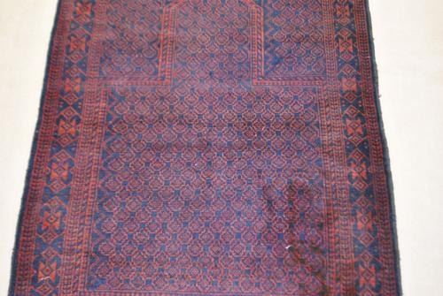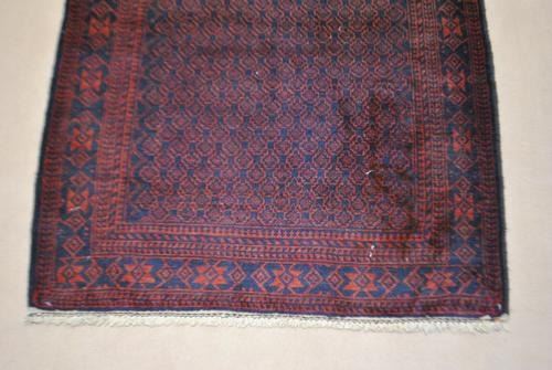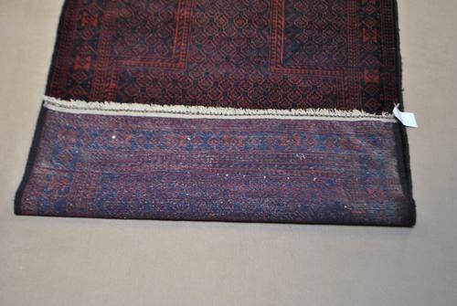 Nice looking hand woven authentic Persian Balooch. Made of fine quality lamb's wool pile on wool foundation. Incorporating a nice looking allover design and framed beautifully by an intricately done geometric border. Balouch Rugs are all collectible examples of nomad art as each piece exploits the design skills and showcases the individuality of each weaver. Balouch hand-woven Rugs using beautiful vegetable dyed baluchi wools. Size: 2 feet 11 inches X 4 feet 9 inches. Hand woven in Baloochistan from Iran.
