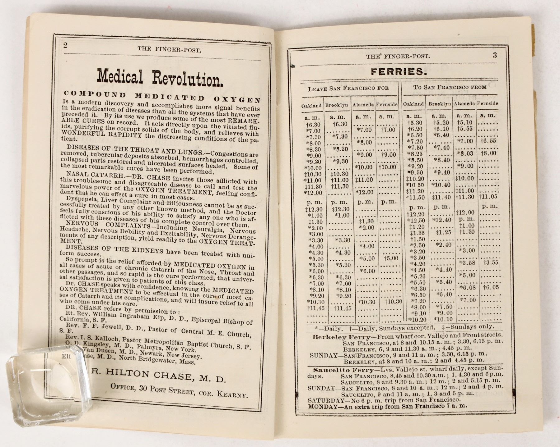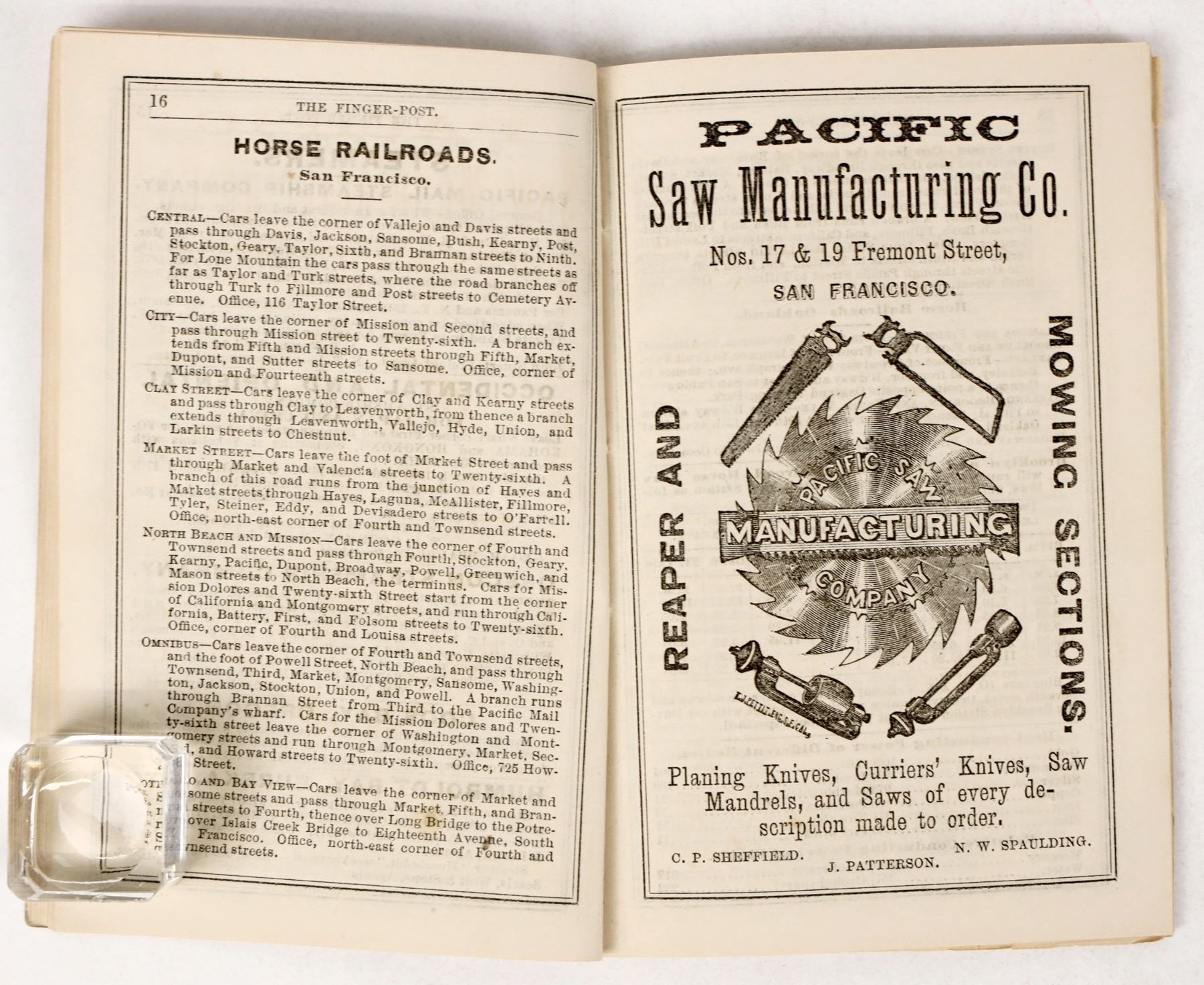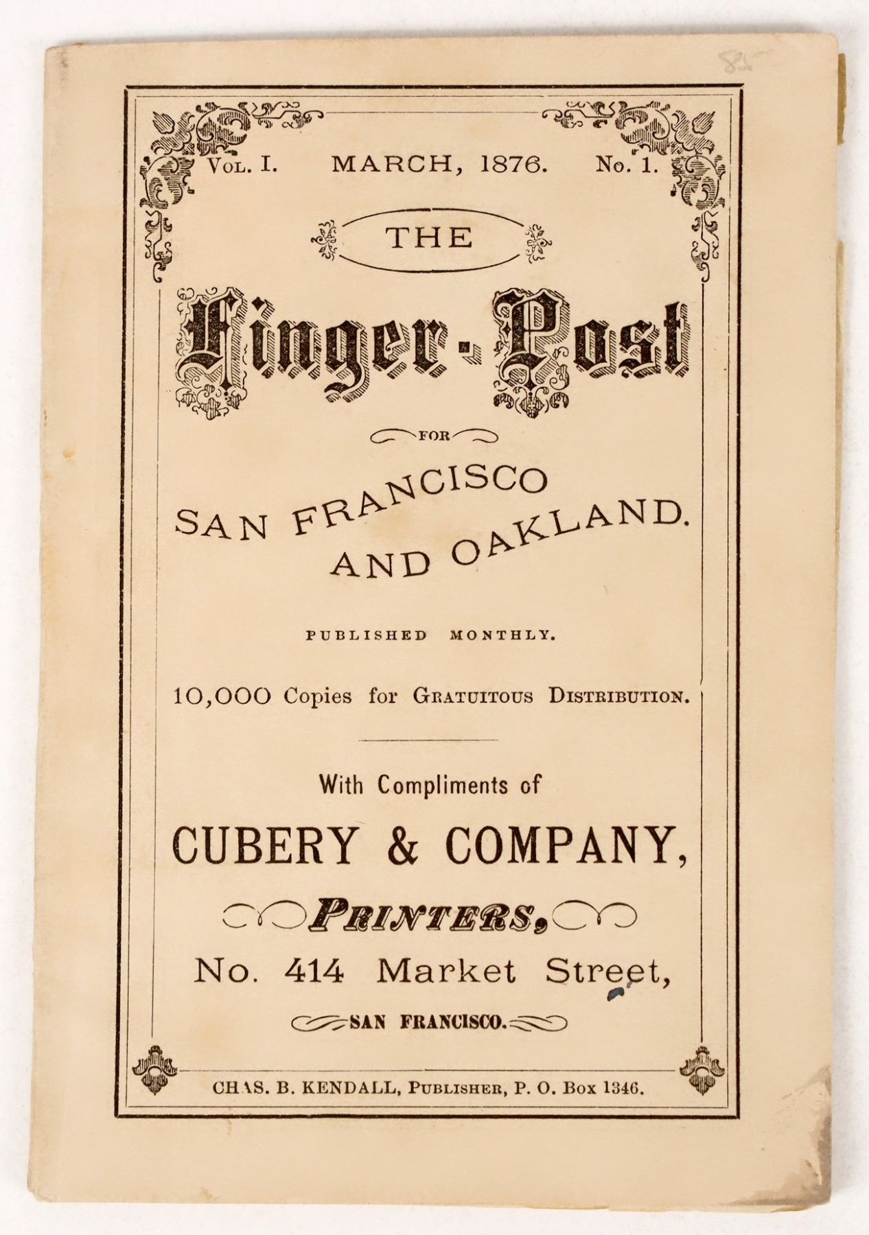 Finger Post Booklet Vol. 1. March, 1876. No. 1. For San Francisco and Oakland. Published monthly. 10,000 copies for gratuitous distribution. With compliments of Cubery & Company, Printers, No. 414 Market Street. San Francisco. Chas. B. Kendall, Publisher. 48 pages with index. 3.5 x 5.5 inches.