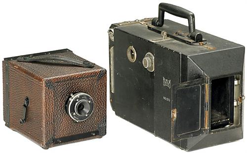"Fingerprint" and "Hicro" Camera 1) Seiki Kogaku, Japan (early Canon). "Seiki Fingerprint Camera", no. 819, with rollfilm back, for size 2 1/3 x 3 1/6 in., metal body, with lighting device, Seiki lens 4,5/75 mm. - And: 2) Hess-Ives Corp., USA. "Hicro Camera", 1915, box-shaped camera for color photos 3 1/4 x 4 1/4 in. by the colour separation process via multiple exposures with filters. Lens 1:16, shutter I, B, T, early and rare version of Hicro.<Br>