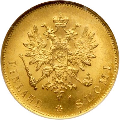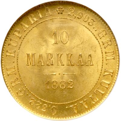 Finland. 10 Markkaa, 1882-S. Fr-5; KM-8.2. Alexander III of Russia. Very scarce condition. NGC graded MS-65.