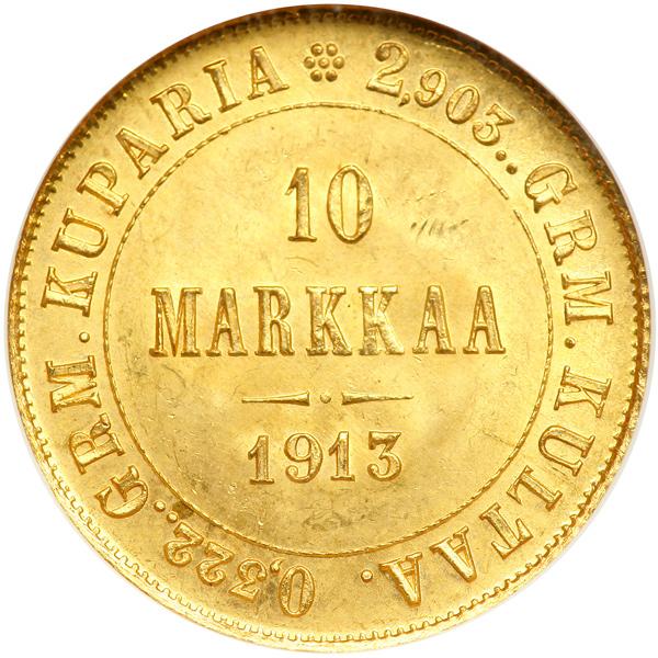 Finland. 10 Markkaa, 1913-S. Fr-6; KM-8.2. Nicholas II of Russia. Crowned eagle. Reverse: Value. NGC graded MS-65.