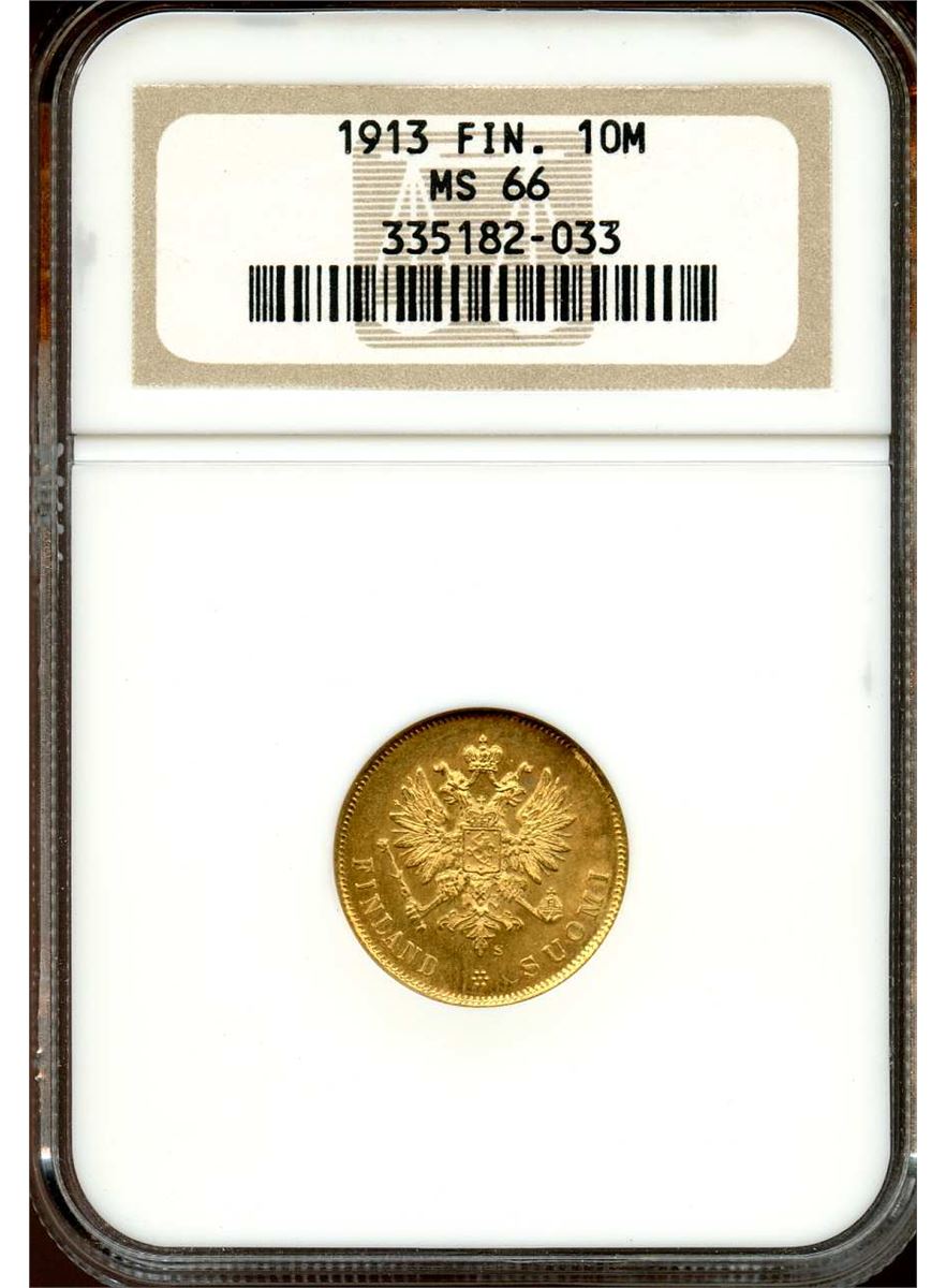 Finland 1913 S, Gold 10 Markkaa, KM 8.2, Perfect coin with fantastic luster, NGC certified MS-66 Gem