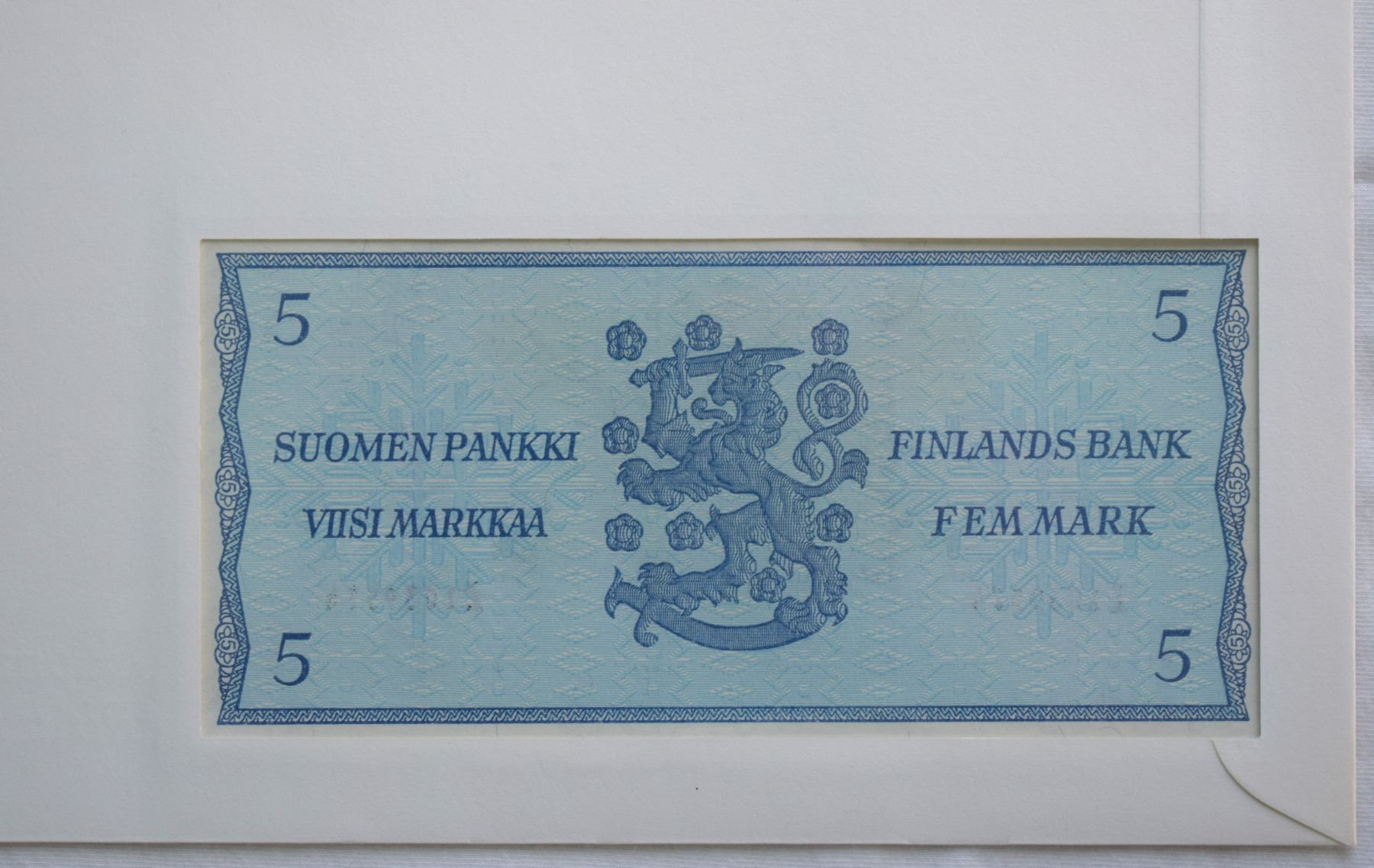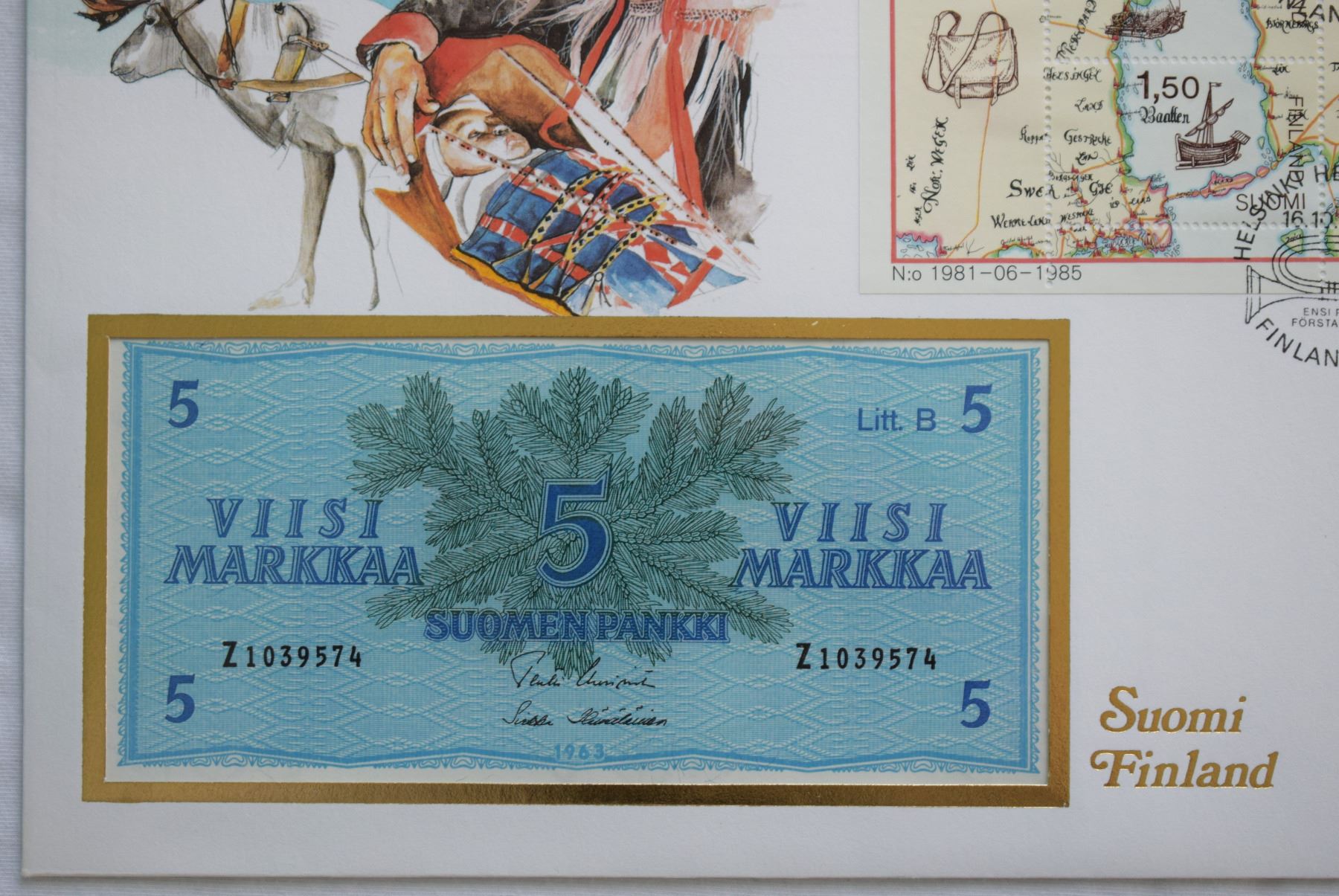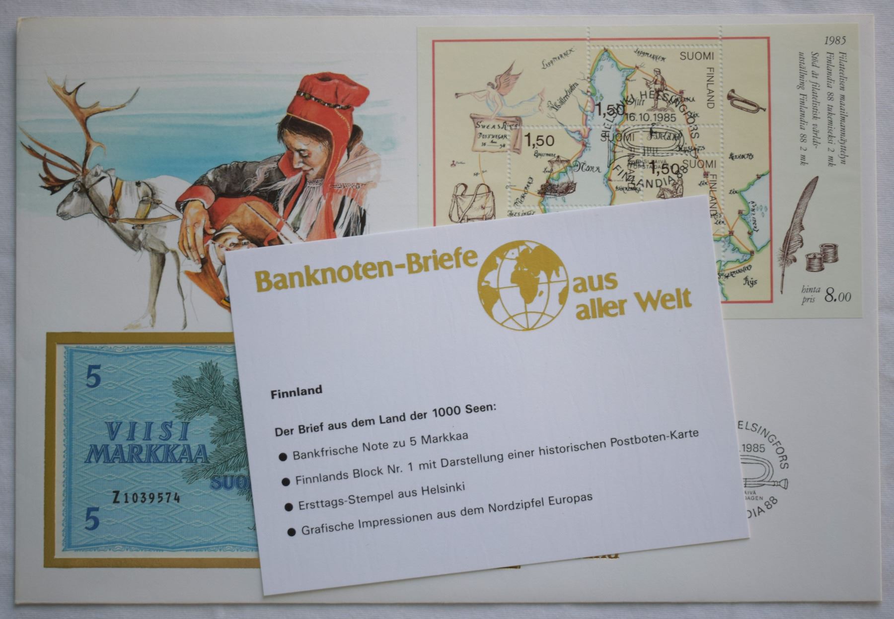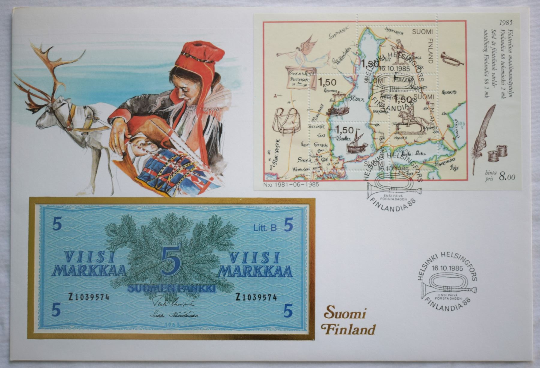 Finland, 5 Markkaa 1963 First Day Cover Swiss Issued, Pick# 99a Nice Vignette "Reindeer & Woman w/ BB" and Philatelic Souvenir Sheet w/ 4 stamps, Cancelled Philateic Postage in Helsinki 1985 Mint as Issued W Presentation Card, Impecable.