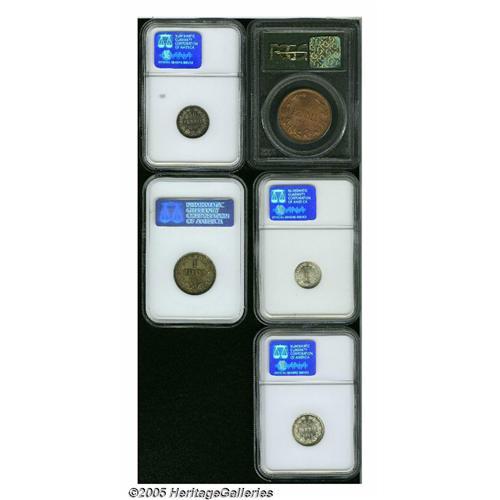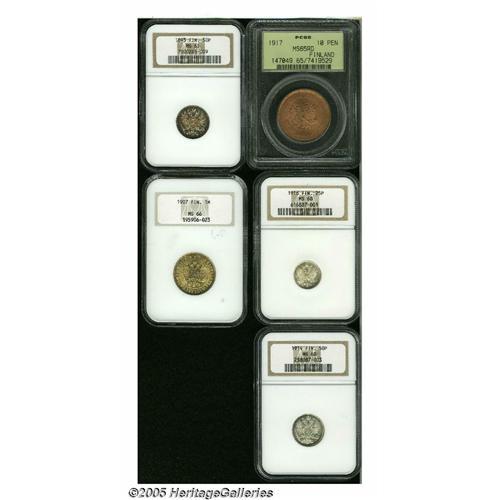 <B>Russian Duchy Mint State Assortment, </B></I>25 Pennia 1916 MS68 NGC, 50 Pennia 1893 MS65 NGC, deeply toned and attractive, 50 Pennia 1914 MS68 NGC, Markka 1907 MS66 NGC, and Kerenski government 10 Pennia 1917, MS65 Red PCGS.