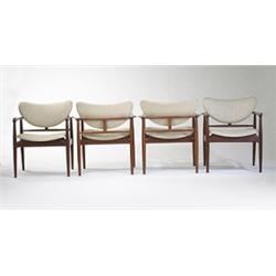 Finn Juhl model #48 armchairs, set of eight Niels Vodder Denmark, 1948 teak, wool upholstery, brass 27.5"w x 23"d x 31"h Branded marks: [Niels Vodder Cabinetmaker, Copenhagen Denmark, Design Finn Juhl]. Literature: Danish Chairs, Korinsha Press, Oda, pg. 90