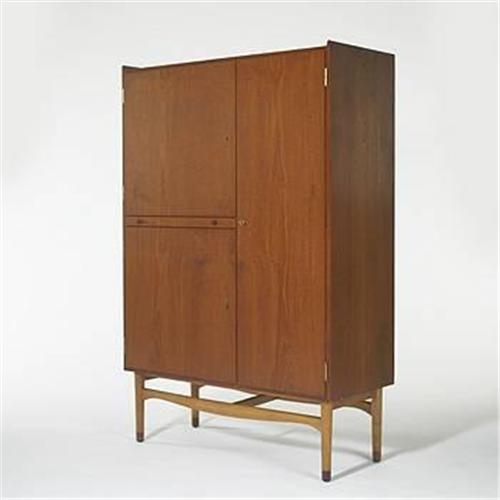 Finn Juhl service cupboard Denmark, c. 1950 teak, beech, brass 41 w x 18.5 d x 62 h inches Featuring pull-out flat serving shelf and three doors concealing four adjustable shelves and eight adjustable drawers.