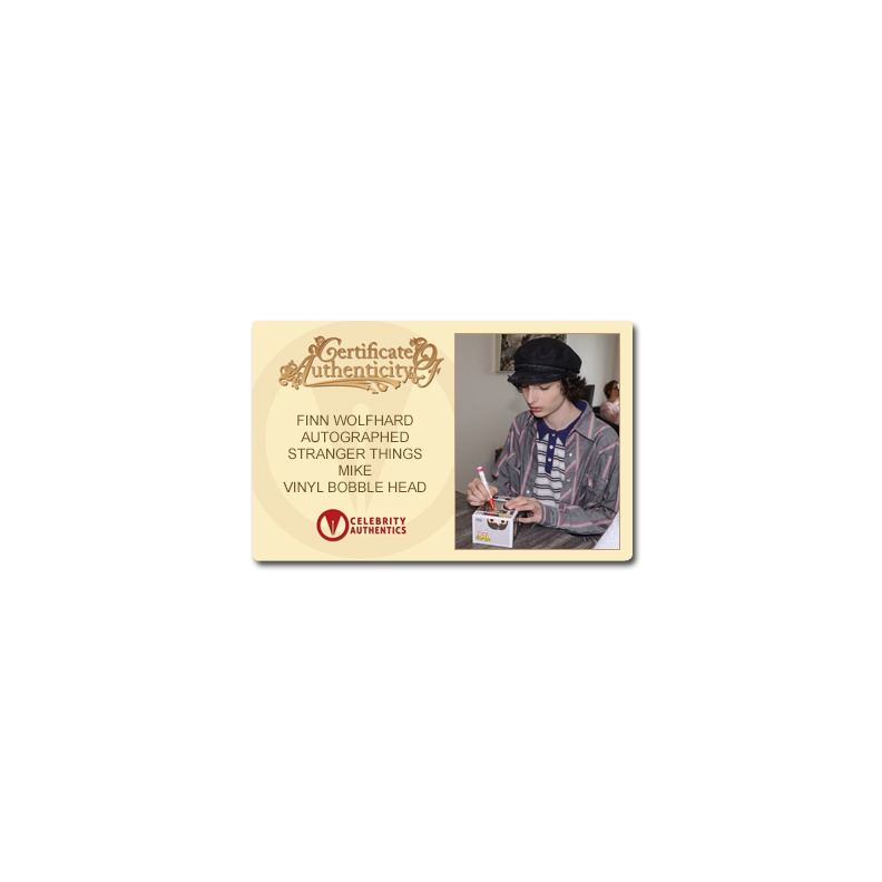 This Stranger Things Mike POP Vinyl Figure #423 has been personally hand-signed by rare autograph signer Finn Wolfhard during his signing with Celebrity Authentics. Ships in acid free protective display case affixed with the Celebrity Authentics serial-numbered and tamper evident Authentication Hologram and includes Celebrity Authentics Certificate of Authenticity featuring picture of Finn signing the box. Stock image used for product images. Item ships with clean, unsmudged autograph in similar location.