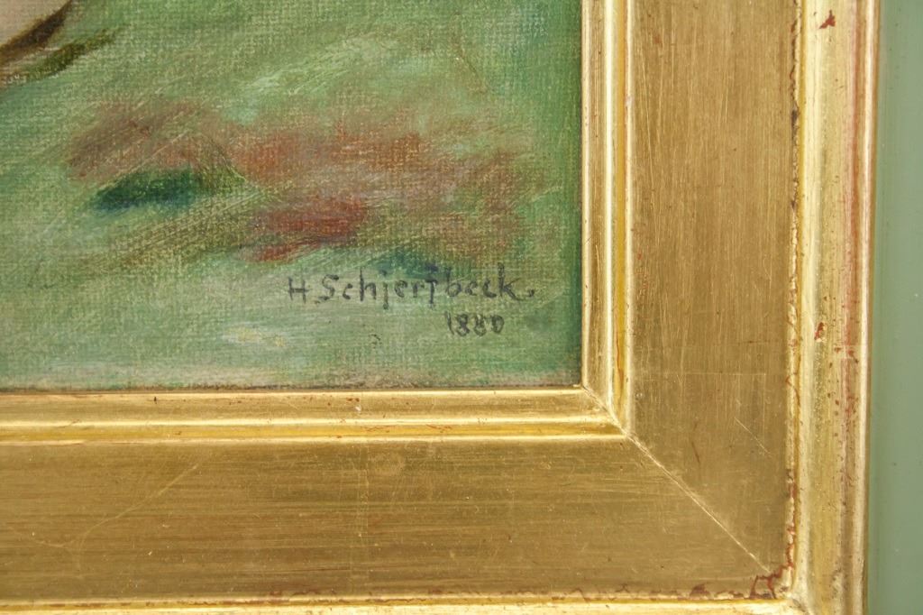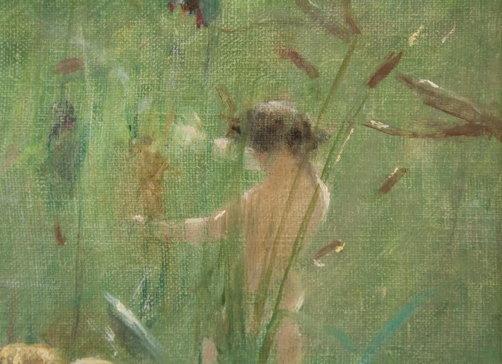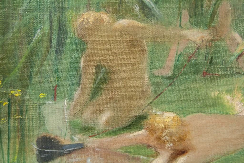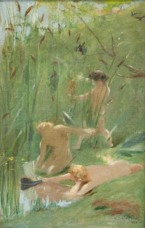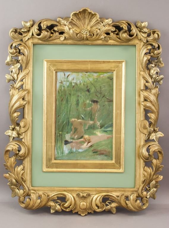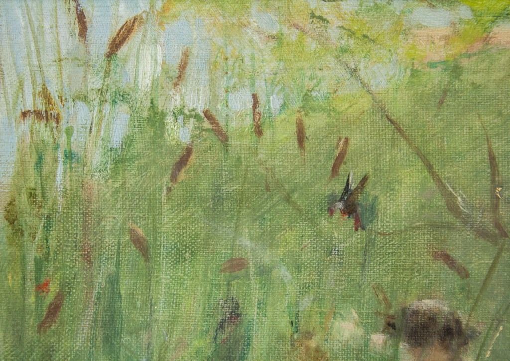 Oil on canvas, framed. Featuring three figures among some reeds by the water. Signed "H. Schjerfbeck" to the bottom right corner, with "1880" inscribed beneath the signature. "BLANCHET / Rue Bonaparte 32 PARIS" stamped on verso. Canvas size: 27 x 18 cm (10.75 x 7.25 inches). Frame size: 64 x 48 cm (25 x 19.5 inches).