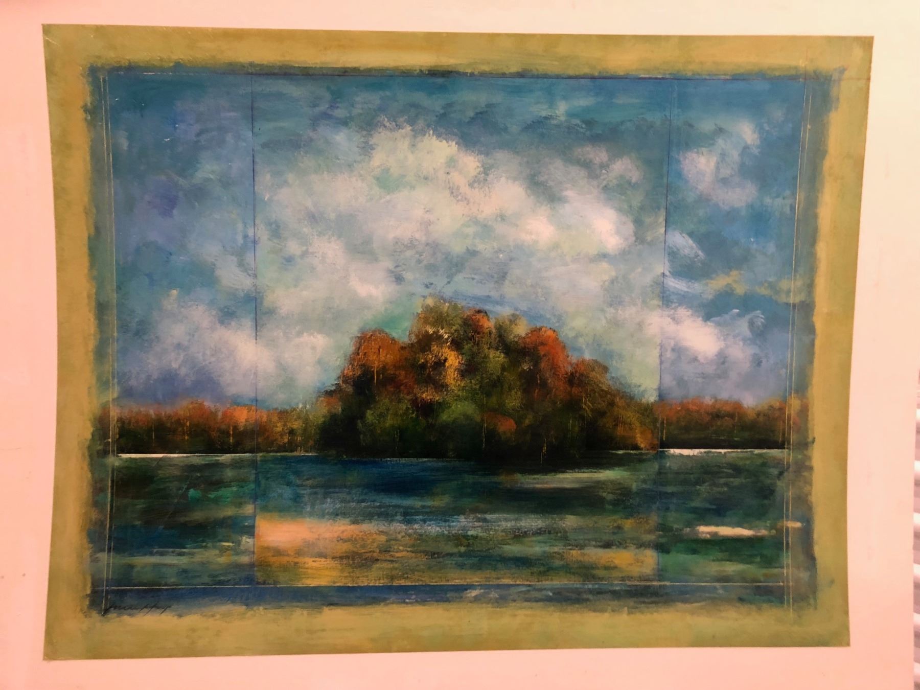 One Fiona Hoop - landscape Blue Sky . Original Encaustic on board. Height is 26 inches. Width is 34 inches. The shipping charge for this item is $65.