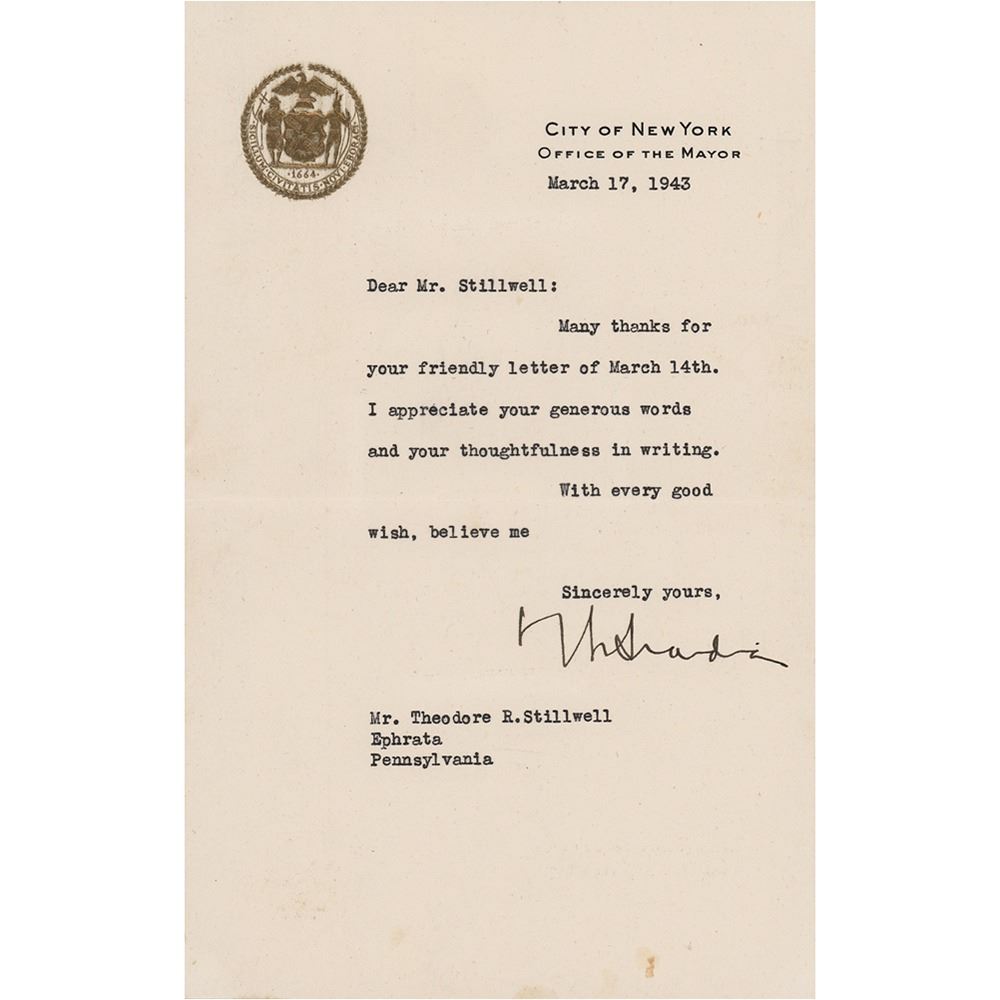 World War II-dated TLS signed “F. LaGuardia,” one page, 5.25 x 8.25, City of New York, Office of the Mayor letterhead, March 17, 1943. Letter to noted autograph collector Theodore R. Stillwell, in full: "Many thanks for your friendly letter of March 14th. I appreciate your generous words and your thoughtfulness in writing." In fine condition. Accompanied by the original mailing envelope and by a full letter of authenticity from JSA.