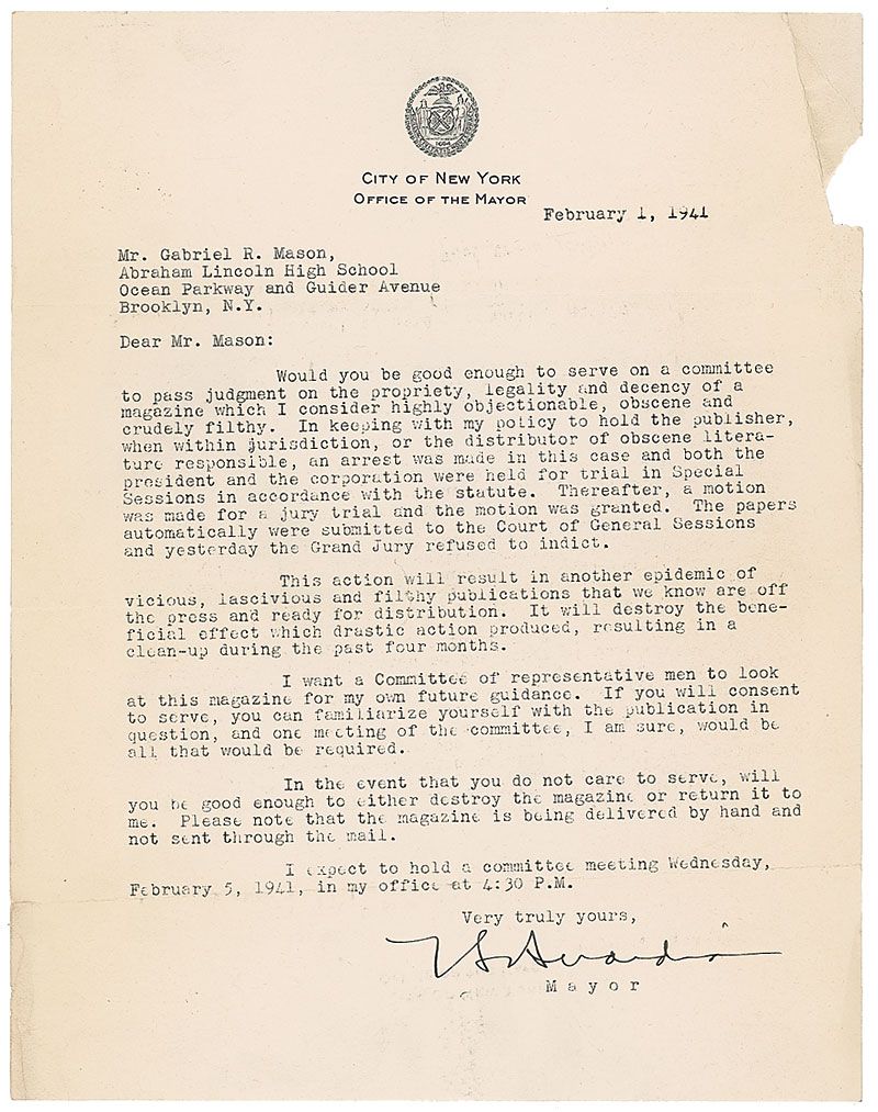 TLS signed “F. LaGuardia,” one page, 8.25 x 10.5, City of New York letterhead, February 1, 1941. Letter regarding an obscenity trial. In part: “Would you be good enough to serve on a committee to pass judgment on the propriety, legality and decency of a magazine which I consider highly objectionable, obscene and crudely filthy….an arrest was made in this case and both the president and the corporation were held for trial…and yesterday the Grand Jury failed to indict. This action will result in another epidemic of vicious, lascivious and filthy publications.” A crease and area of paper loss to the upper right corner, otherwise fine condition.