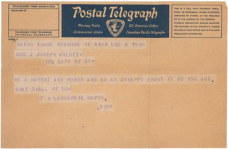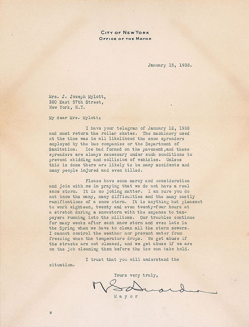 TLS, one page, 8 x 10.5, City of New York, Office of the Mayor letterhead, January 15, 1938. Letter to a constituent. In part: “Please have some mercy and consideration and join with me in praying that we do not have a real snow storm. It is no joking matter. I am sure you do not know the many, many difficulties and the many costly ramifications of a snow storm…Our troubles continue for many weeks after each snow storm and even late in the Spring when we have to clean all the storm sewers. I cannot control the weather nor prevent water from freezing when the temperature drops. We get abuse if the streets are not cleaned, and we get abuse if we are on the job cleaning them before the ice can get hold.” Light diagonal strips of toning, otherwise fine condition. Accompanied by the original mailing envelope as well as a telegraph sent to the same recipient the previous month.