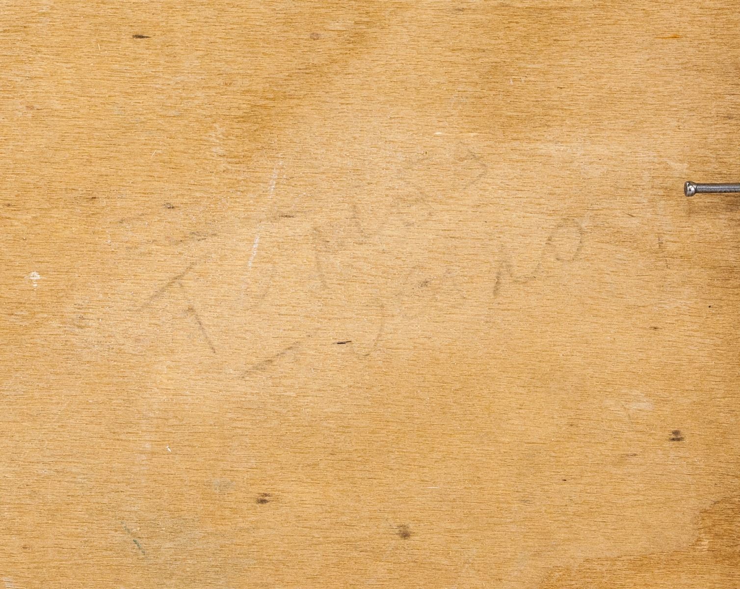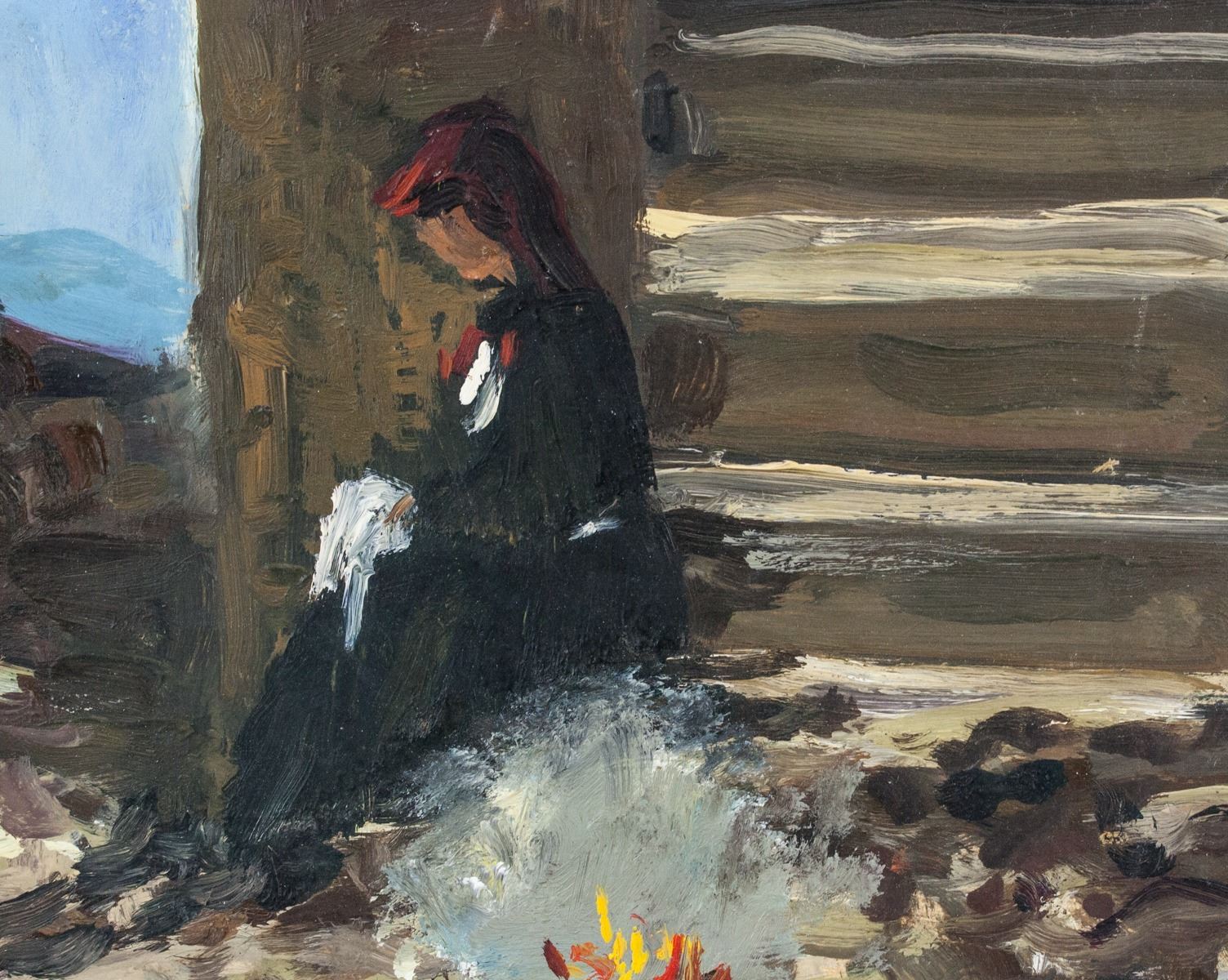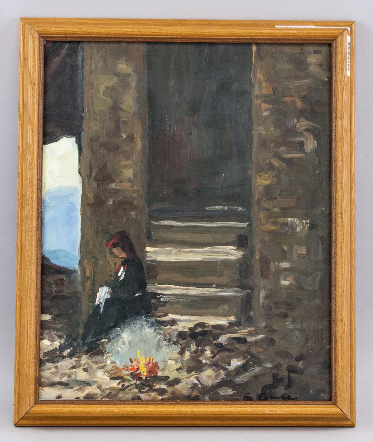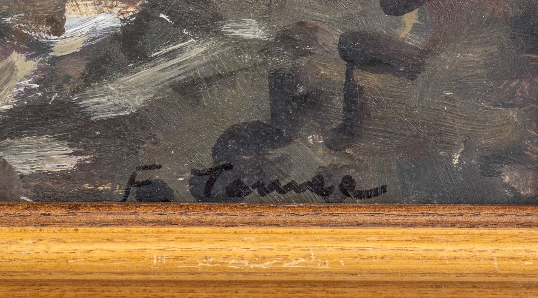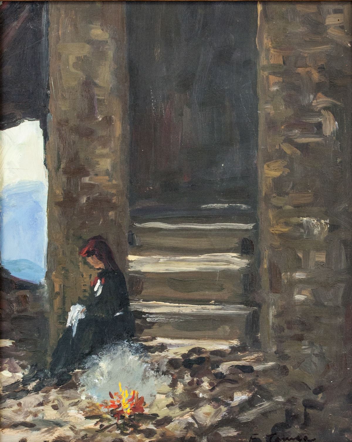 Oil on board, framed. Featuring a portrait of a woman by the fireside. Signed F. Tomea on the lower edge. Inscribed in pencil illegibly on verso. Attributed to Fiorenzo Tomea (1910-1960, Italian). 40 x 37 cm (15.5 x 14.5 inches). Framed size: 46 x 40 cm (18 x 15.5 inches). PROVENANCE: Southern Ontario estate