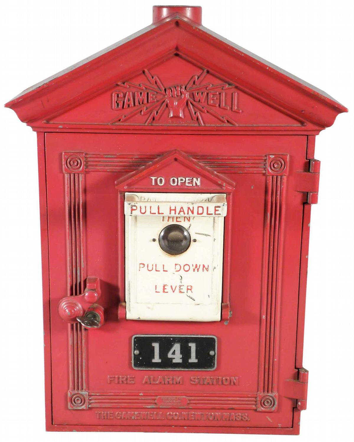 Fire Alarm Street Box Station # 141. Mfg by The Gamewell Co. Newton, Mass. Very good condition, comes with key. 12 1/2 X 16 3/4 X 6 1/4 inches.