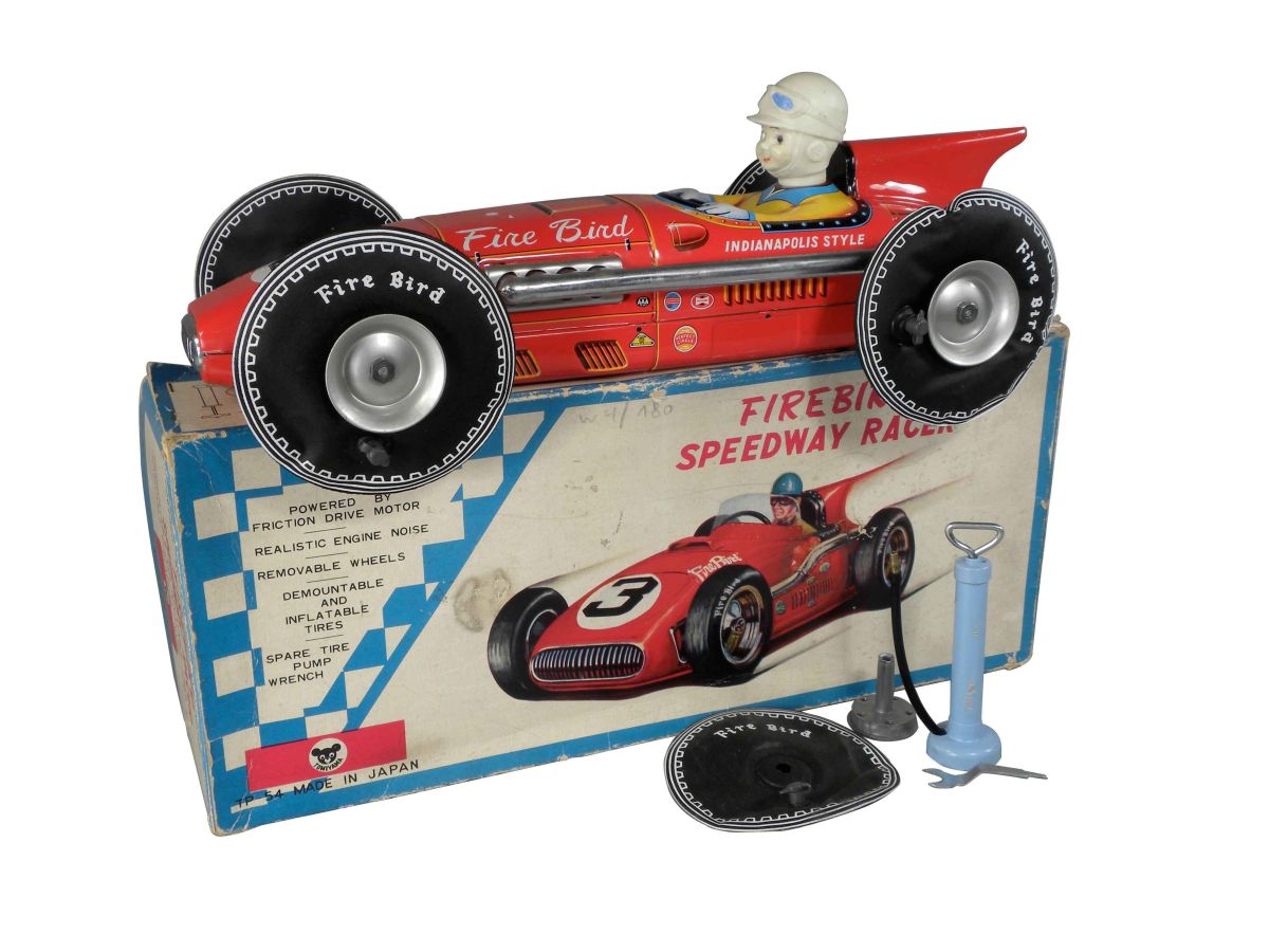 Fire Bird Speedway Racer Tin Toy in original box. Has inflatable tires and engine noise. Made by Tomiwama, Japan. Comes with tire pump and extra tire. Car has price tag residue on hood otherwise excellent condition, box has a few stains. 14 1/2 inches long.