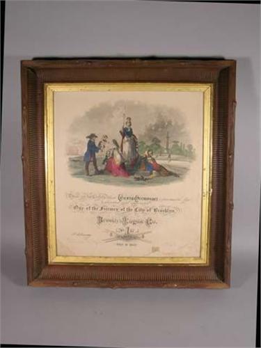 Fire certificate for Brooklyn Engine Co., Sept. 6, 1866, 16" 18" Image, some tears & stains.