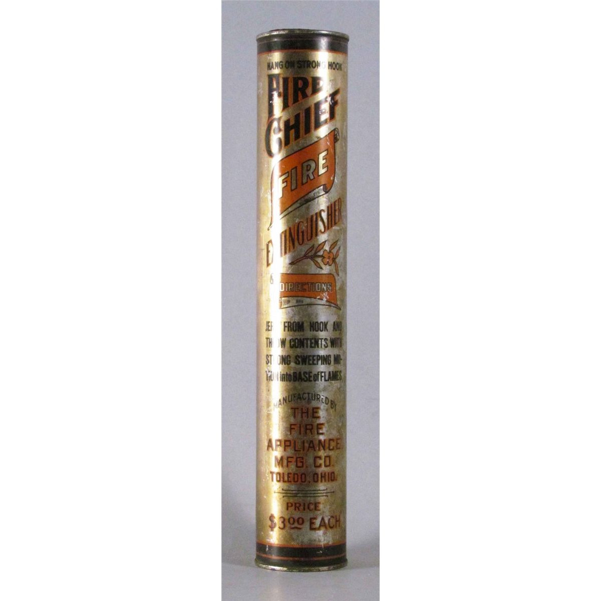 Fire Chief Brand Fire Extinguisher Tin. Some scratches and discoloration. 12 inches tall. Start Price $20