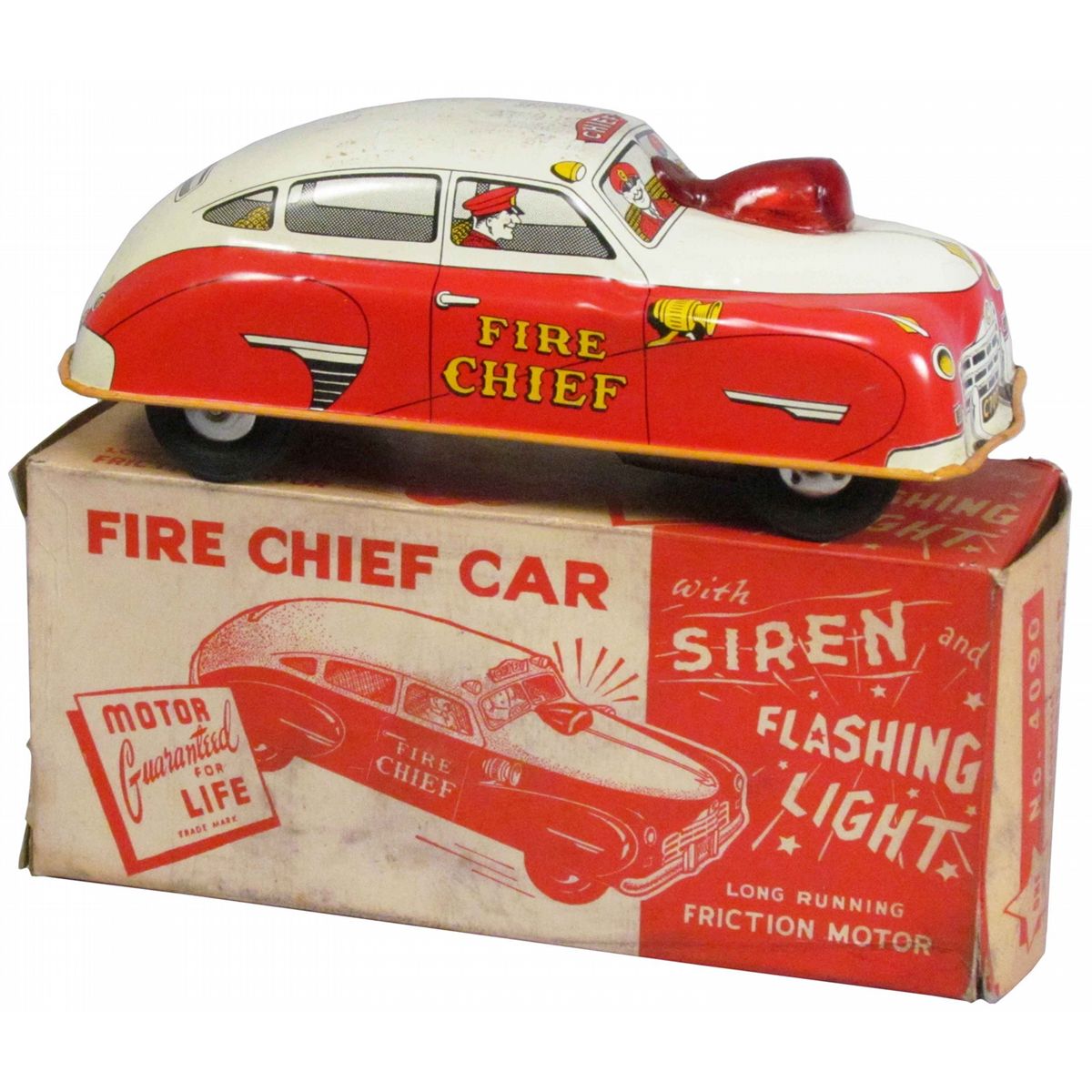 Fire Chief Car Tin Toy by Cortland in original box. No. 4090. Cortland Mfg. Co. Inc. Camden, NJ. Excellent condition. 7 1/4 inches long.