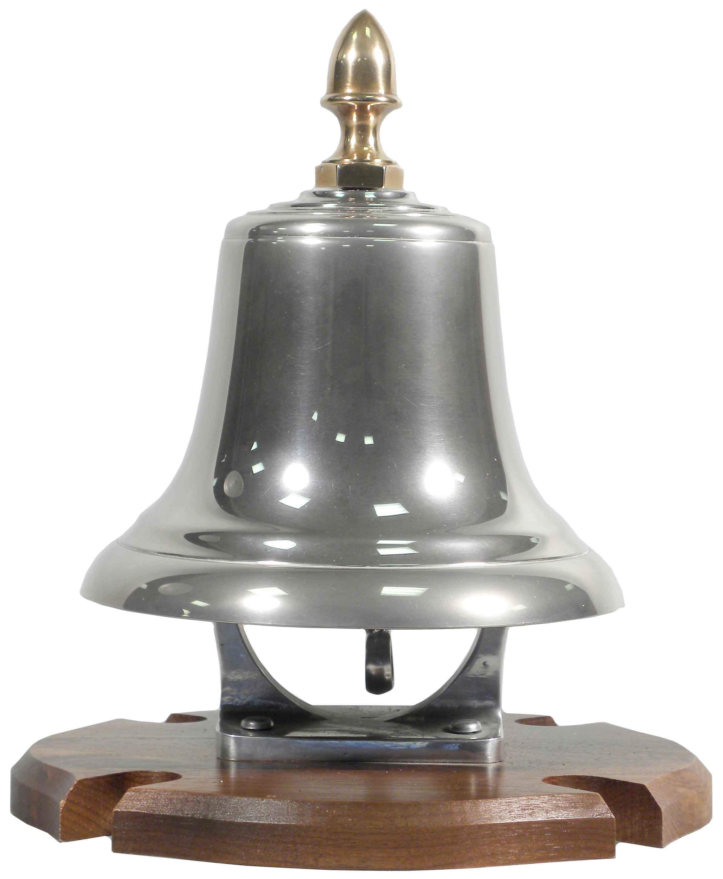 Fire Engine Bell with Nickel plated with brass finial. Mounted on walnut base. Excellent condition. Bell measures 7 1/2 inch diameter.