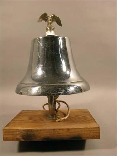 Fire engine bell with eagle finial, chrome, mounted on wood base, 12"T x 12" diameter. Ex. cond.