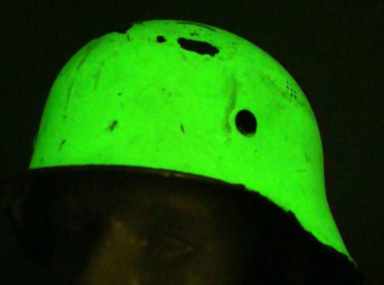 Fire Fighter Helmet * Details: White, glows green in the dark, leather top supports and neck protectorSize: 57