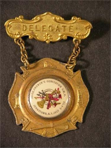 Fire fighting medal pin with celluloid center - delegate for Tri-County Fireman's convention Johnstown, NY, July 3 & 4, 1908, 3" long.