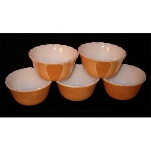 6 oz. deep custard cups in copper tint. All are in excellent condition with no chips, each piece is signed with the Fire King logo-