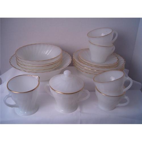 <table width="100%" border="0" cellspacing="0" cellpadding="4"><tr><td><em> </em></td></tr><tr> <td width="100%"> This is a partial set of Fire King Golden Shell. They are in very good condition and consist of the following: 1-8.5" rnd. Veg. Bowl, 4- soup bowls, 4- cereal bowls, 4-8oz. cups, 4 saucers, ftd. creamer and ftd. sugar with lid. They are in milk white with gold trim. Order three of anything that we can ship in one container, pay with PayPal and shipping is FREE...