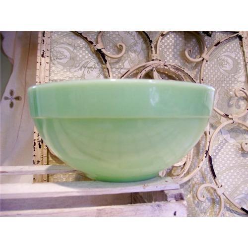 Here is a hard to find Fire King Jadeite bowl in the "Colonial Kitchen" shape. This bowl is the 7 3/16" size, Middle of the 3 bowl set. The bowl is in excellent condition with great color and shine. No chips or rough edges. Embossed "Fire King Oven Ware" on the bottom.