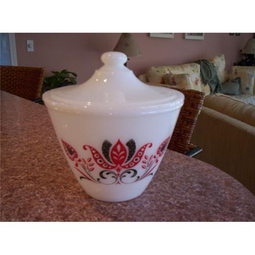 This is a grease jar that has a 5.5" diameter and stands 5.5" tall. It was made by Fire King in their Modern Tulip design. There is little wear to the paint. No chips or cracks are noted. The top fits well and matches the color of the bottom. These grease jars made by Fire King are a hot collectible, and they just keep getting more expensive. If you've been thinking about getting one, maybe you should look today instead of haveing regrets tomorrow.